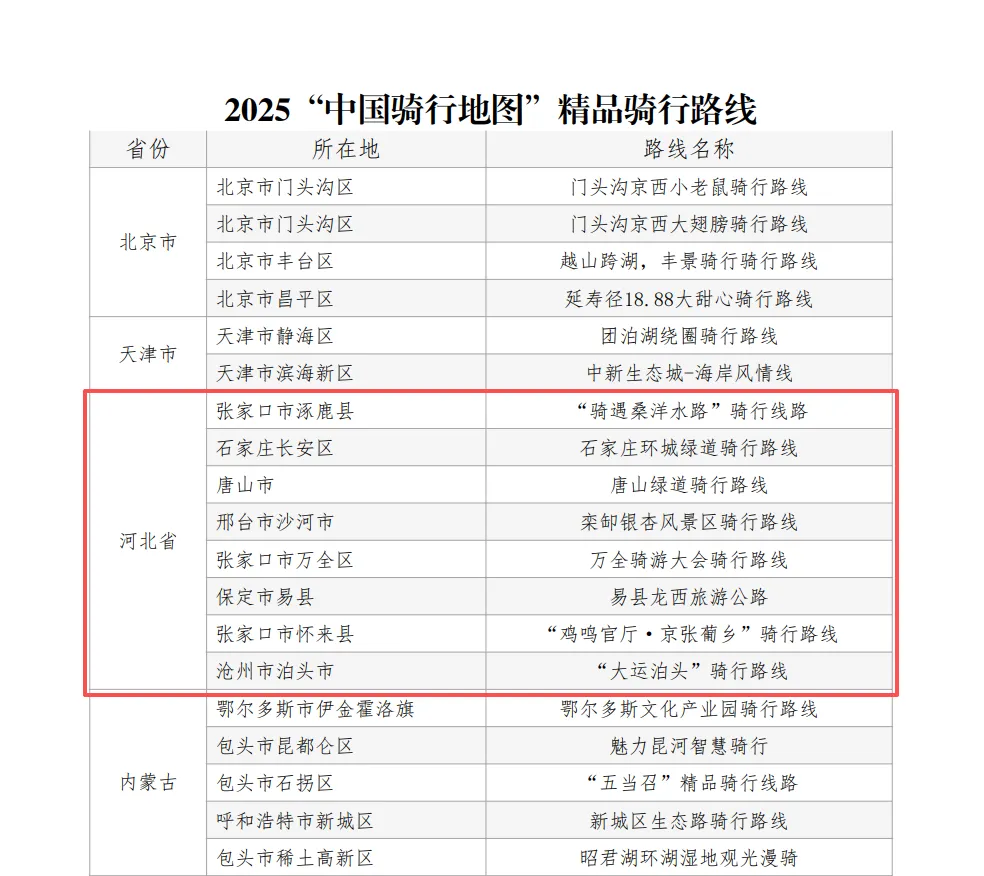 近日,中国自行车运动协会正式发布了“2025中国骑行地图”百条精品骑行路线评选结果。河北省“骑遇桑洋水路”骑行线路、石家庄环城绿道骑行路线等8条骑行路线入选,数量与广东省并列第一。易县龙西旅游公路榜上有名。
